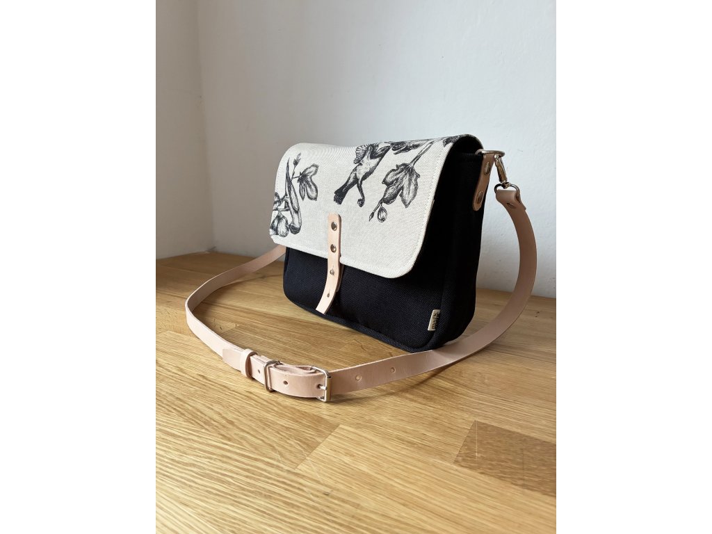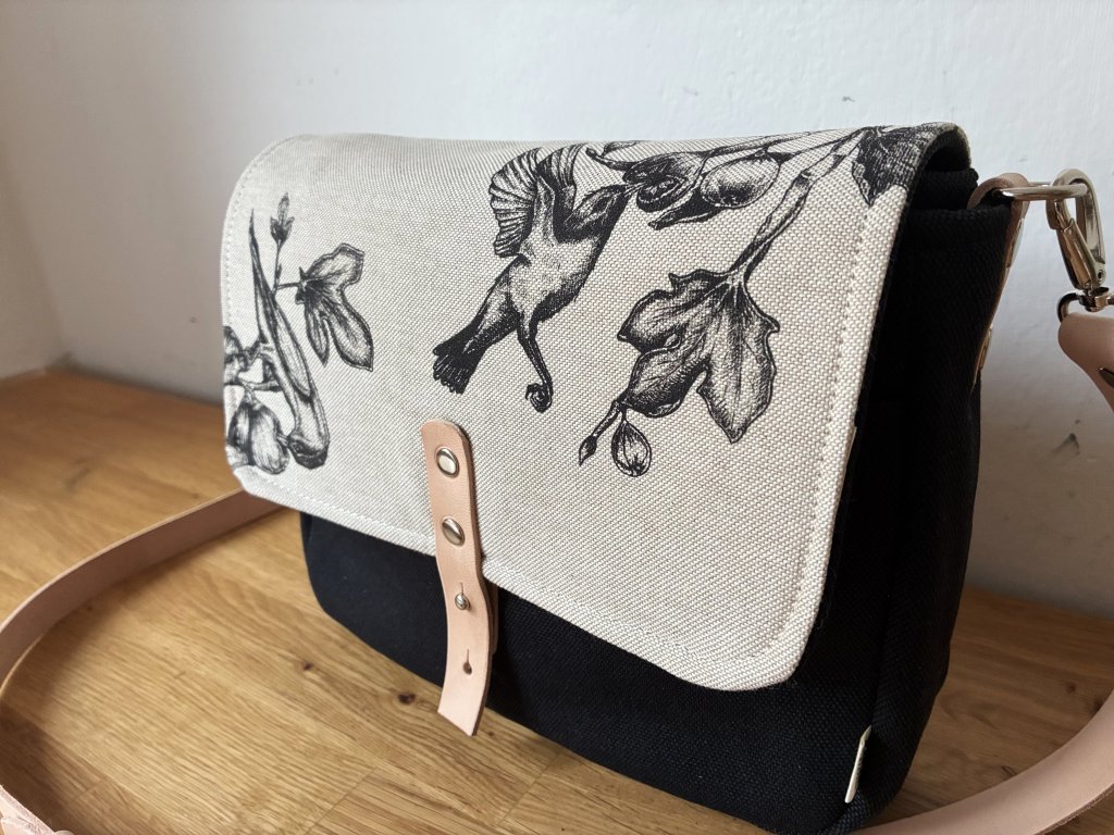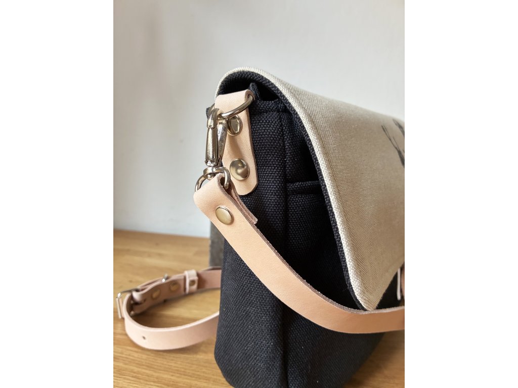 Kabelka je ušitá z pevné potahové látky (z rubové strany vyztuženo) v kombinaci s přírodní látkou, kterou najdete jak uvnitř, tak na klopě. Ta je ozdobena autorským obrázkem ručně natištěným pomocí sítotisku.