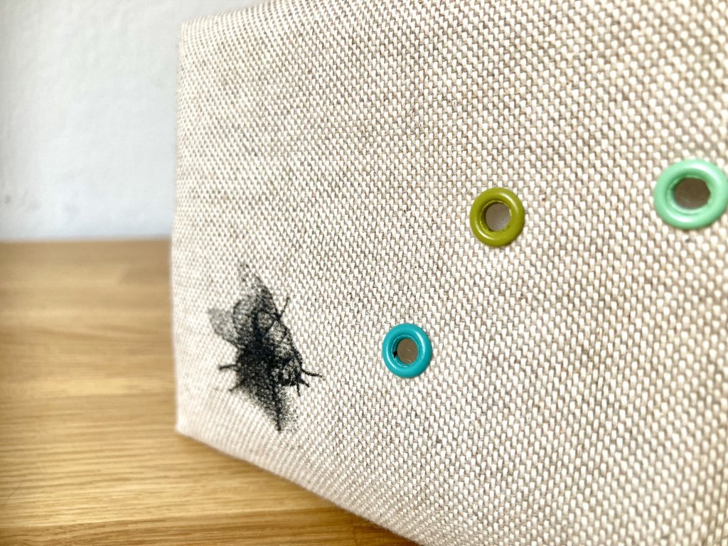 Ručně potištěná autorským sítotiskem a ušitá z režného plátna 80% bavlna a 20% PES, dvou vrstev výplní, díky kterým drží svůj tvar a podšívky ze 100% bavlny.